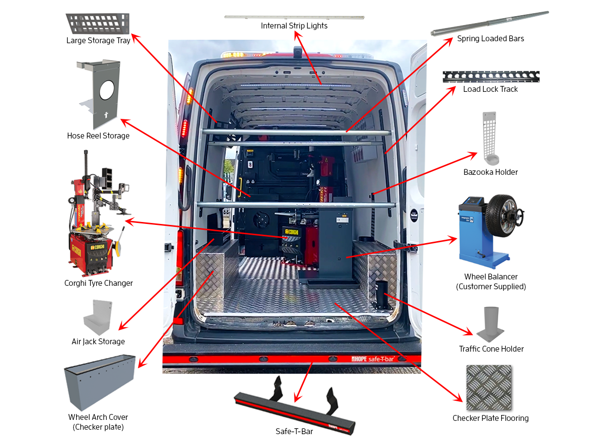 We worked with the customer to design and configure their van to suit their business needs and requirements. We installed our VR40 engine mounted compressed air system alongside a full vehicle fit out. Mobile Tyre Team requested that the items that we powder coat could be black in colour instead of our standard grey. Check out the image below highlighting some of the items we installed to their van.
