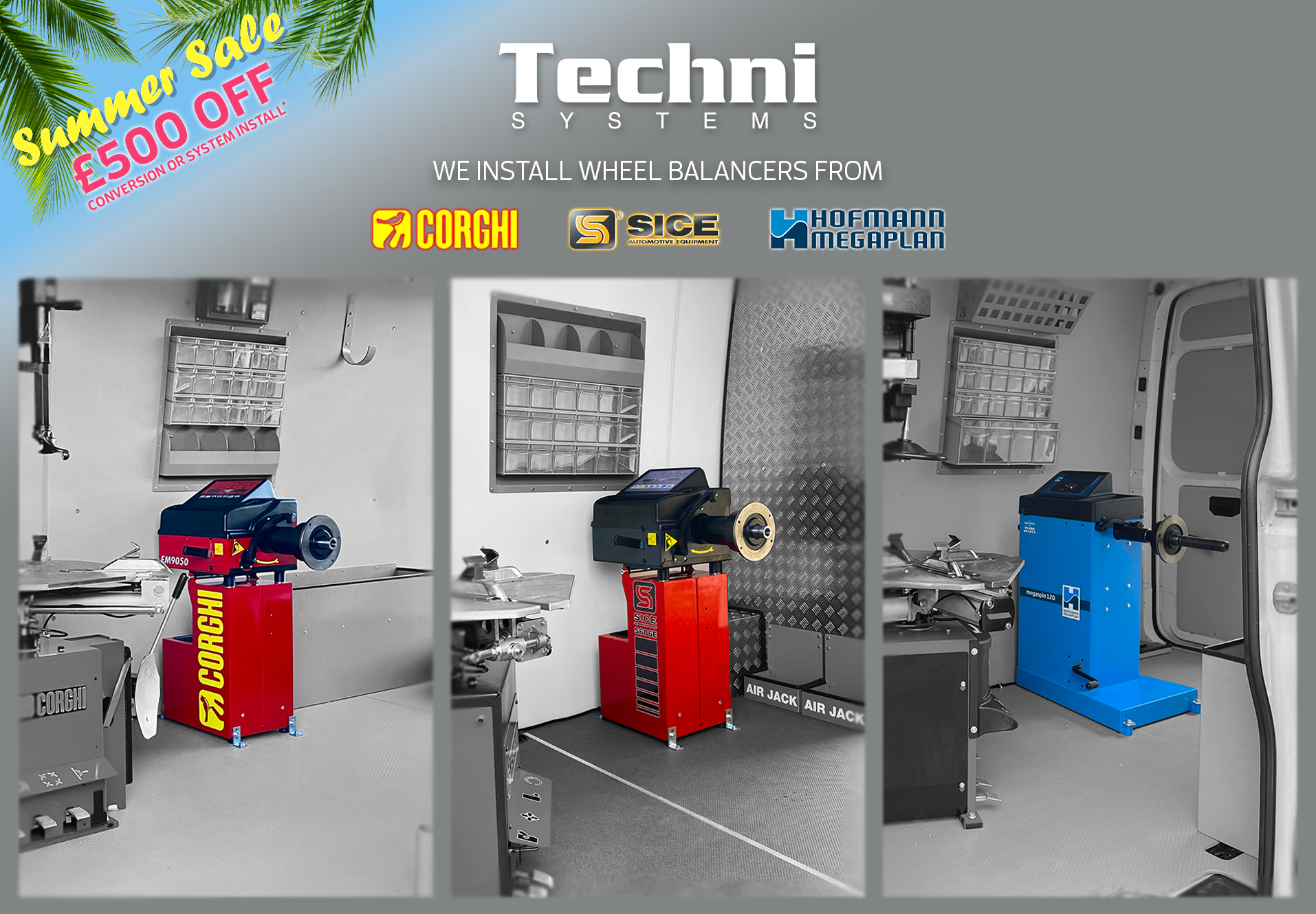 Here at Techni Systems we install wheel balancers from Corghi, Sice and Hofmann Megaplan. Check out our selection below!