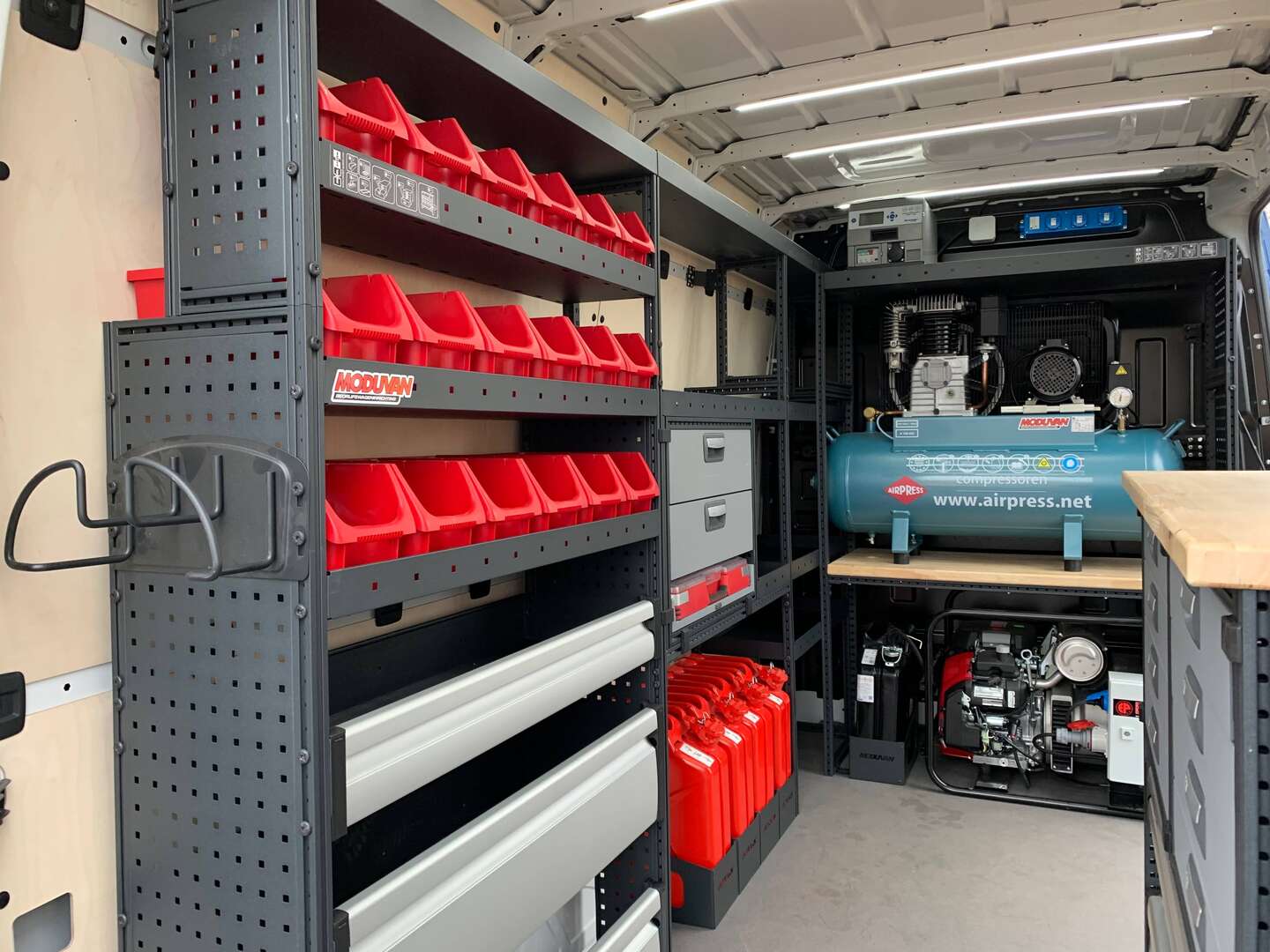 Techni Systems and Moduvan have shared a great partnership now for over 6 years. Moduvan are experts in bespoke vehicle conversions installing racking, lighting, branded signage, tyre changers and much more. Moduvan specialise in many different aspects of vehicle conversion from utility and emergency vehicles to mobile tyre vehicles. With a state of the art showroom based in Kortemark, Moduvan are equipped to convert nearly any kind of vehicle into exactly what their customer requires. Below are a selection of their vehicle conversions.