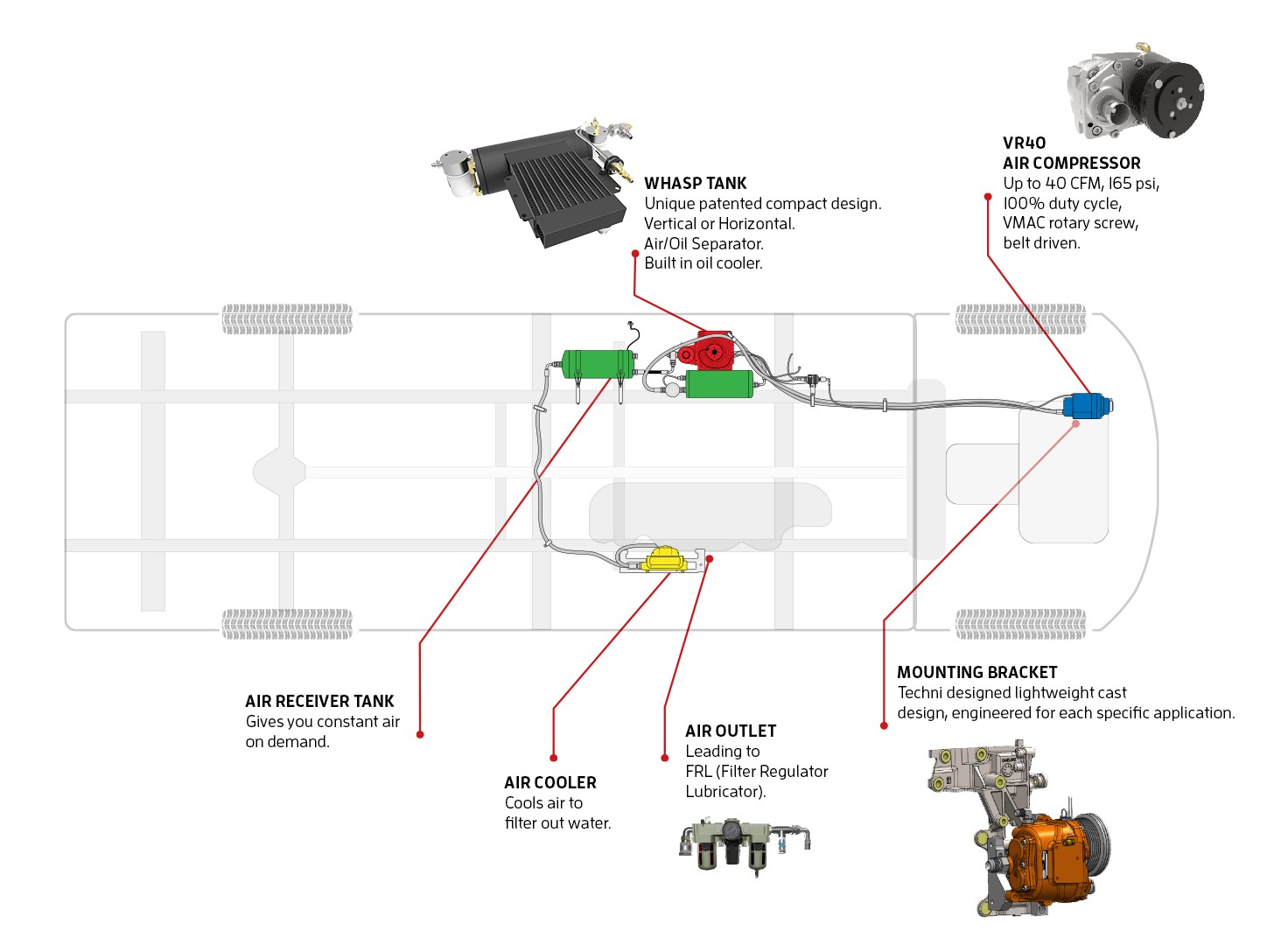 The Techni Systems VR70... The most powerful engine mounted belt driven air compressor available. Delivering a constant 70CFM* and up to 175psi, you will be faster and more efficient with your VR70 compressor.