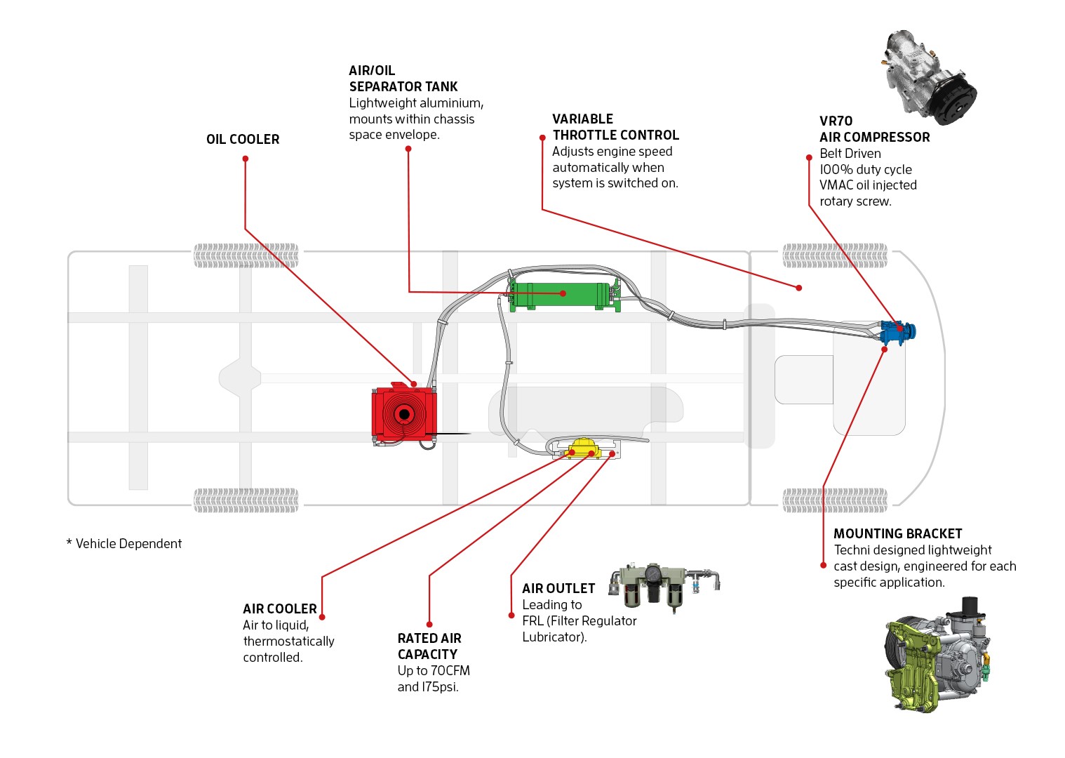 Techni VR range of compressed air systems are powered by the vehicle’s engine. Because they don’t have their own engine that needs constant maintenance, less time and money is spent on fixing engine issues and more time is spent increasing profitability.